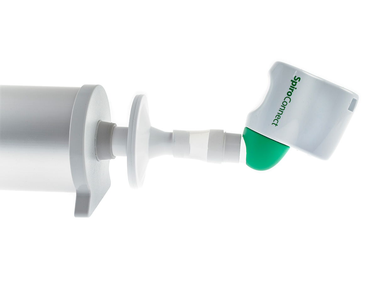 - Ensure your SpiroConnect is attached to the syringe upside down with a good air-tight connection. You may need to use a MicroGard filter adapter and/or a silicone sleeve adapter to get a good connection.