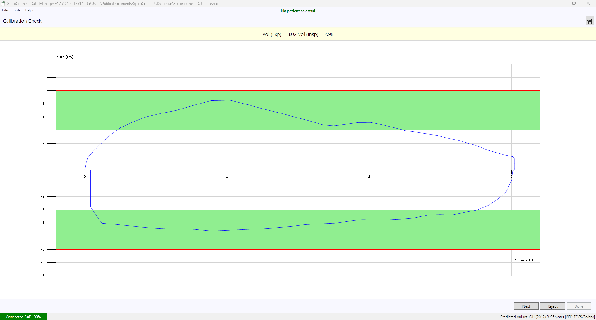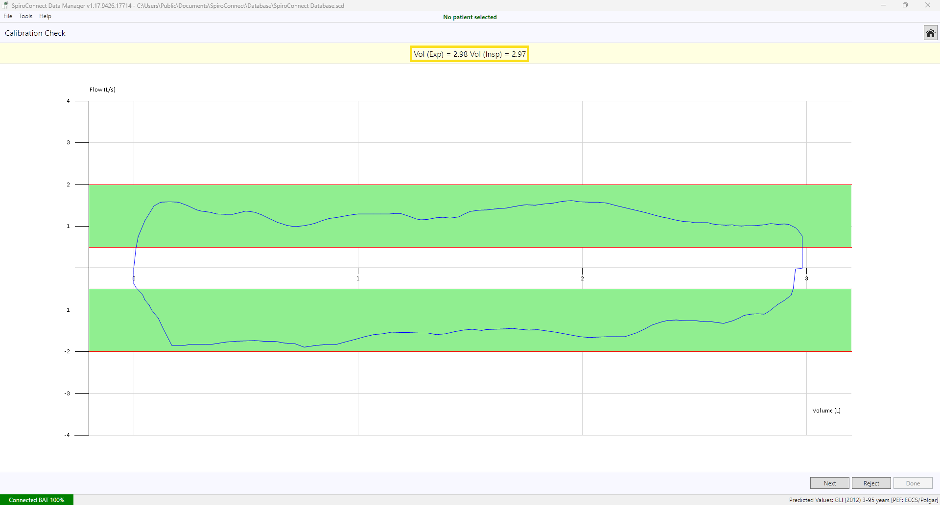 - We start with the slow flow, so with a smooth, steady and slow motion, empty the syringe of air, pause for just a couple of seconds before filling the syringe back up. You need to keep the graph inside the green bands. Once complete, your slow flow measured volumes will be in the yellow banner at the top of the window.