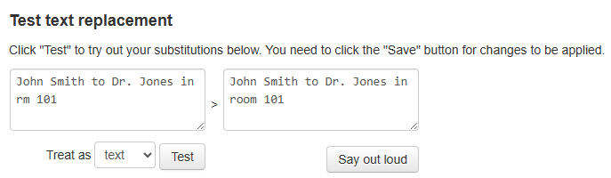 If you want to test how the text-to-speech will sound with a Text replacement, then enter the text as it would appear from the clinical system in the left-hand box and click Test. You can also click Say out loud to hear it spoken on your PC.