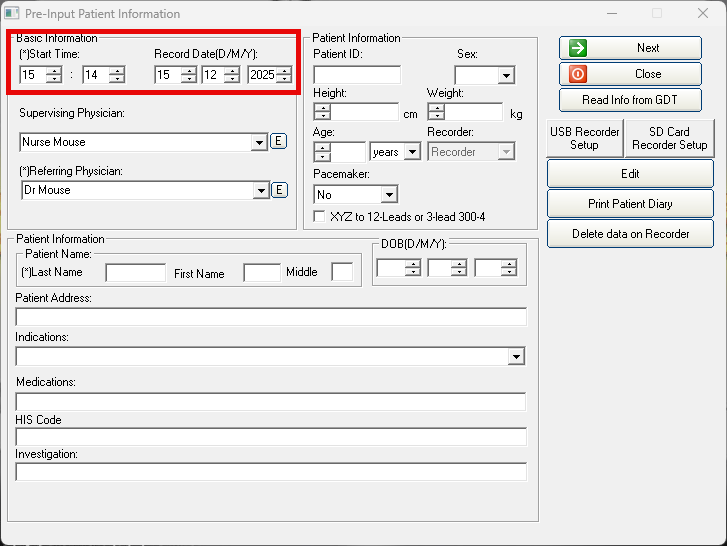 - The Start Time and Record Date need to be set to the time and date of the start of the Holter test.