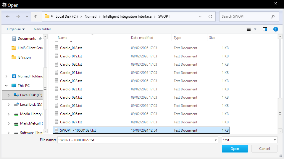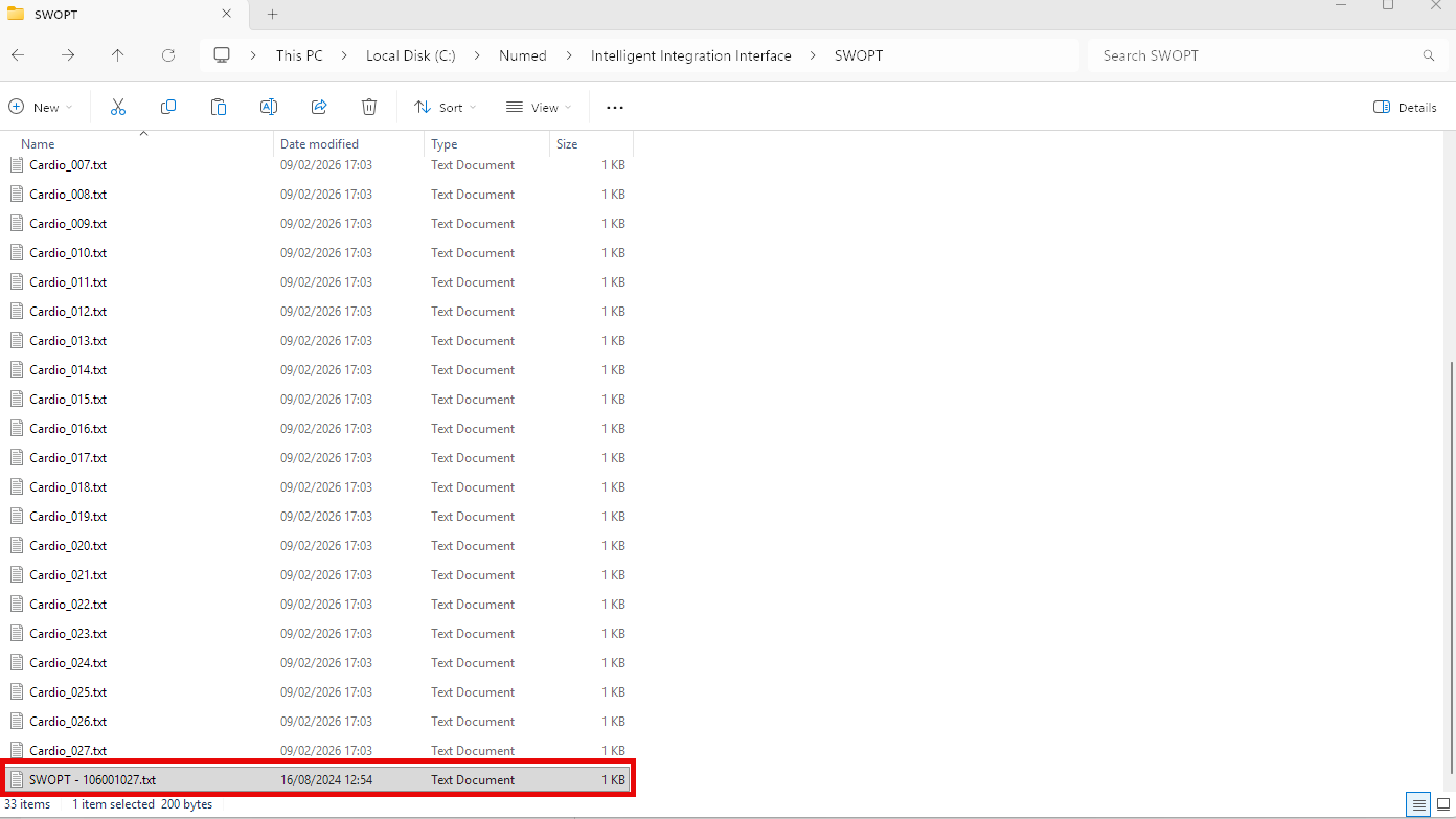 15. Save the supplied option code – typically named SWOPT – serial number.txt to C:\Numed\Intelligent Integration Interface\SWOPT