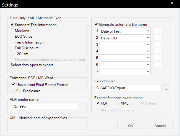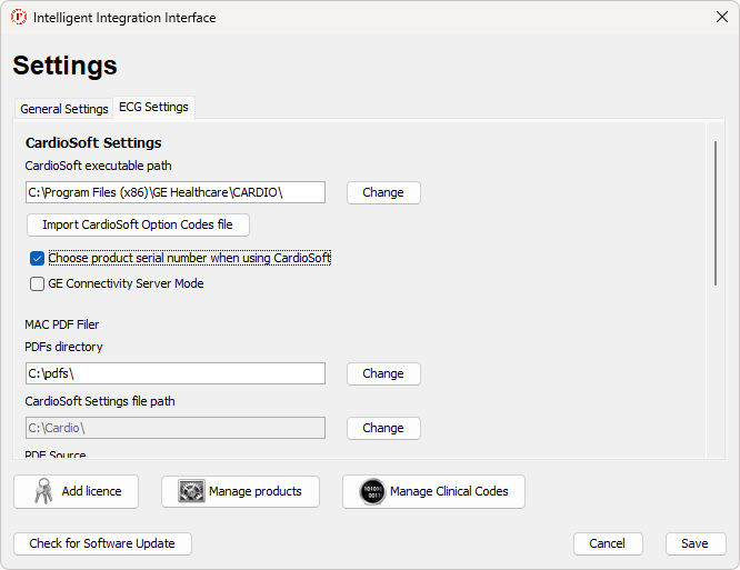 9. Ensure that PDF Source is set to CardioSoft and, if applicable, the Patient ID is set correctly, then click Save and exit the settings