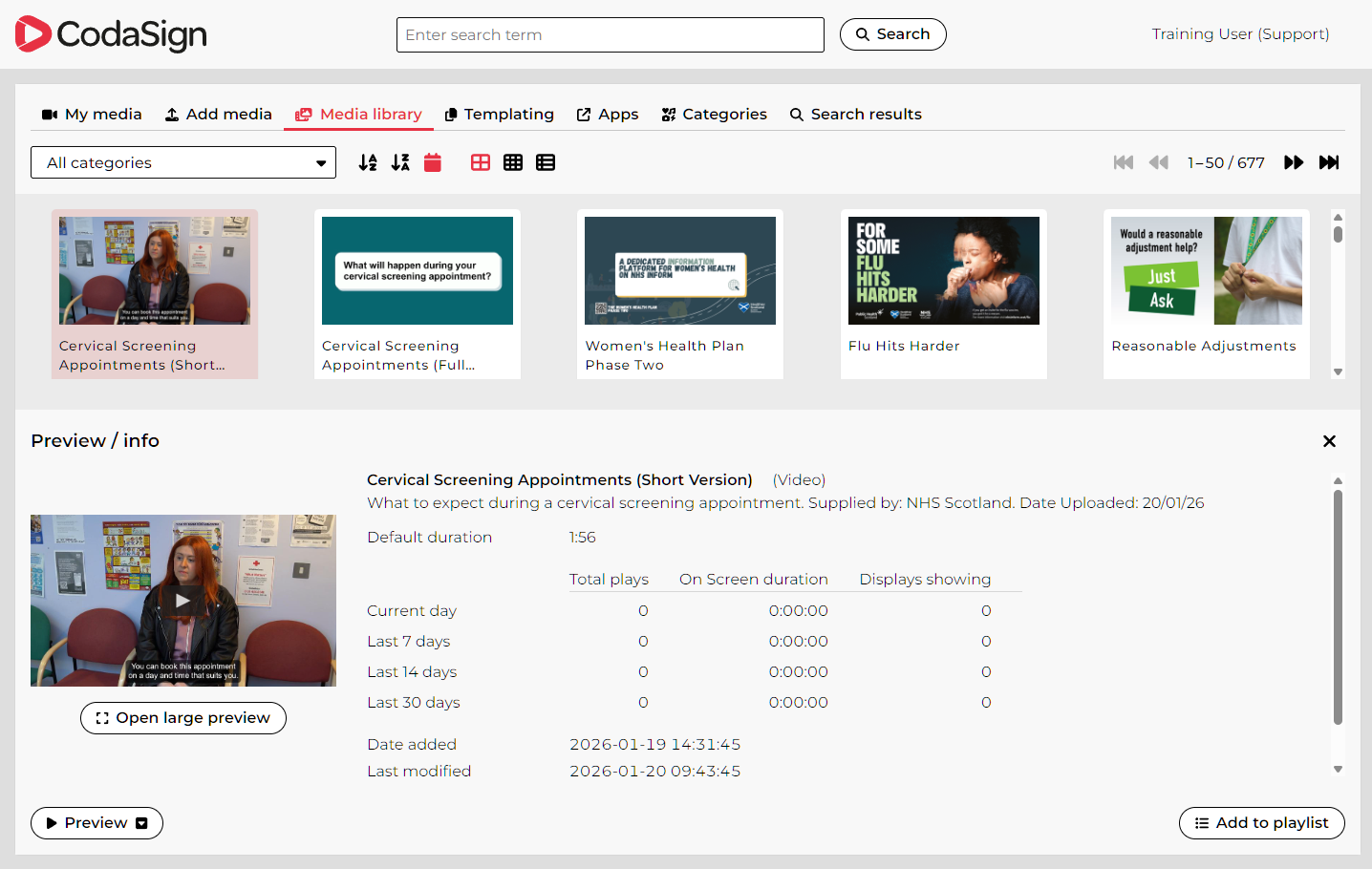 - Usage statistics showing how many times the item has played on your CodaSign Media Player