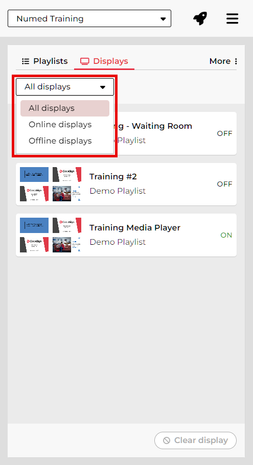 You can use the drop‑down filter to view all displays, online displays only, or offline displays only.