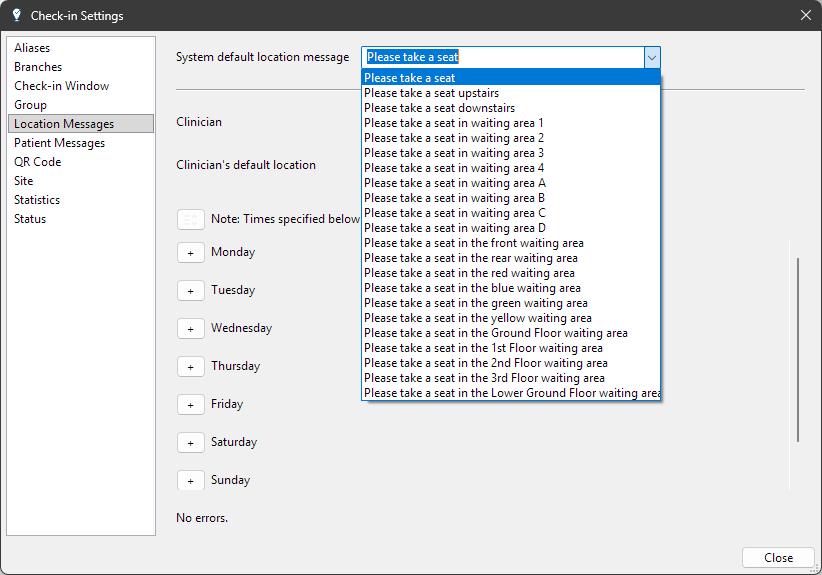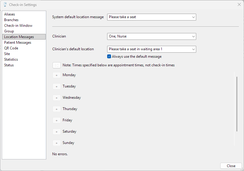 The location message feature allows you to advise patients where to go after check-in. This can be changed for all check-ins or by the clinician. If a clinician moves rooms on a schedule, this can be programmed into the software as well.
