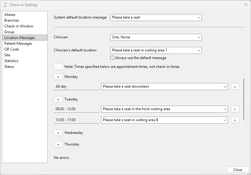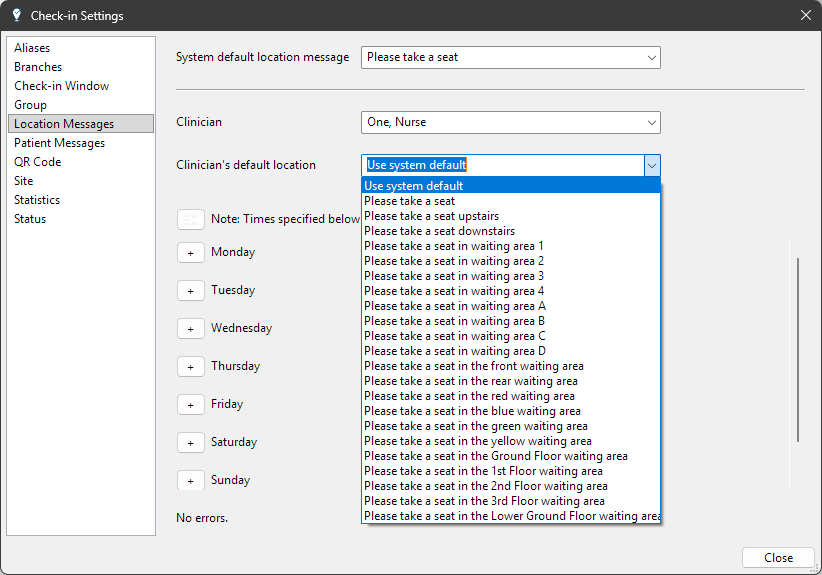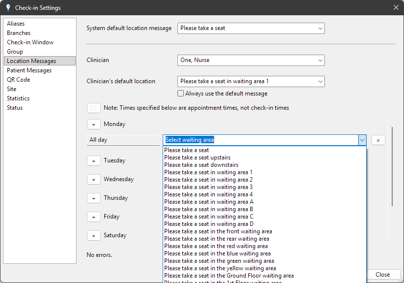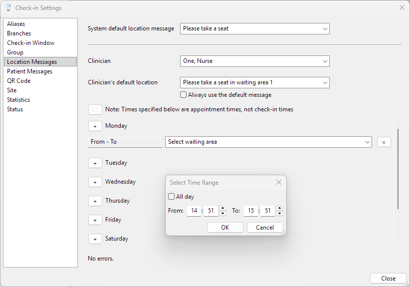 Or if the clinician moves to different waiting areas, you can schedule this into each day. This can be set for either the whole day or a timeframe for appointments within that day. Click the plus against the day, then click From - To to set the time frame. Once you set the time frame or all day, click OK.