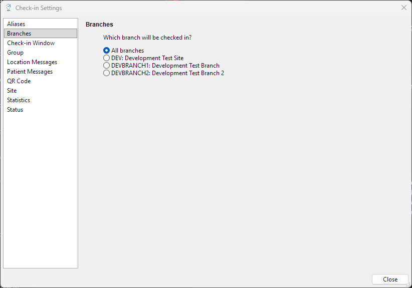 The Branches menu will show a list of site names that have been retrieved from the Clinical Information System. You can select a specific site to limit the ability for patients to only check in for appointments at the chosen site. This prevents, for example, patients whose appointment is at the branch site from checking in at the main site.