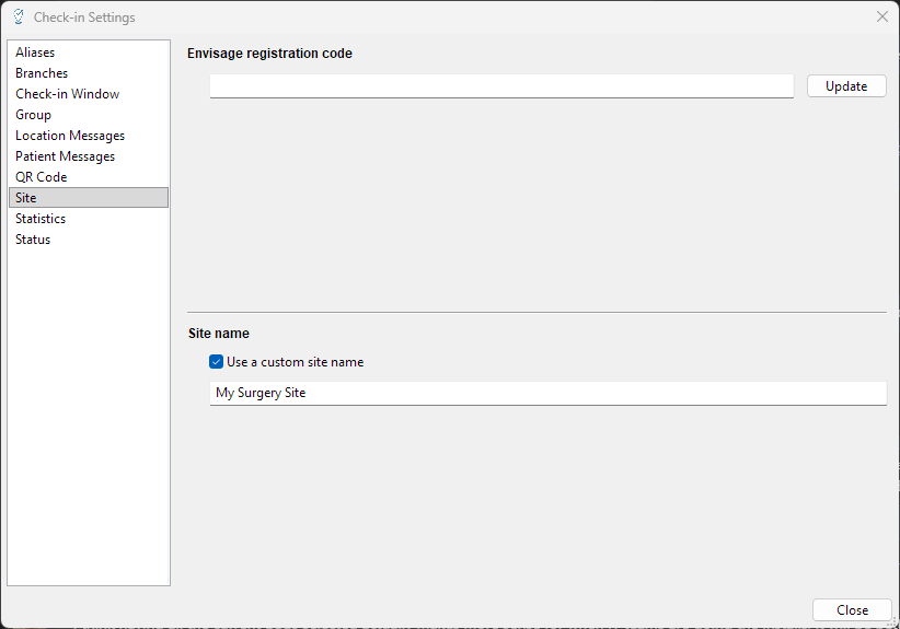 Under the site, you can use a custom site name for your surgery; the system, by default, will get the surgery details from the clinical system. However, this could be a group practice name or all in capitals, for example. By enabling Use a customer site name, you can put your preferred name to be displayed when a patient checks in.