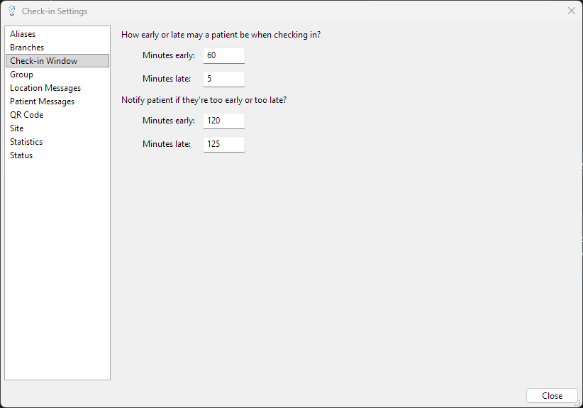 The Check-In Window allows you to adjust the time frame that the software will search for appointments, and either allow the patient to check in or notify them if they are too early or too late. Any check-in attempts outside of this timeframe will advise the patient to go to reception. The timeframe in my image below is the default.