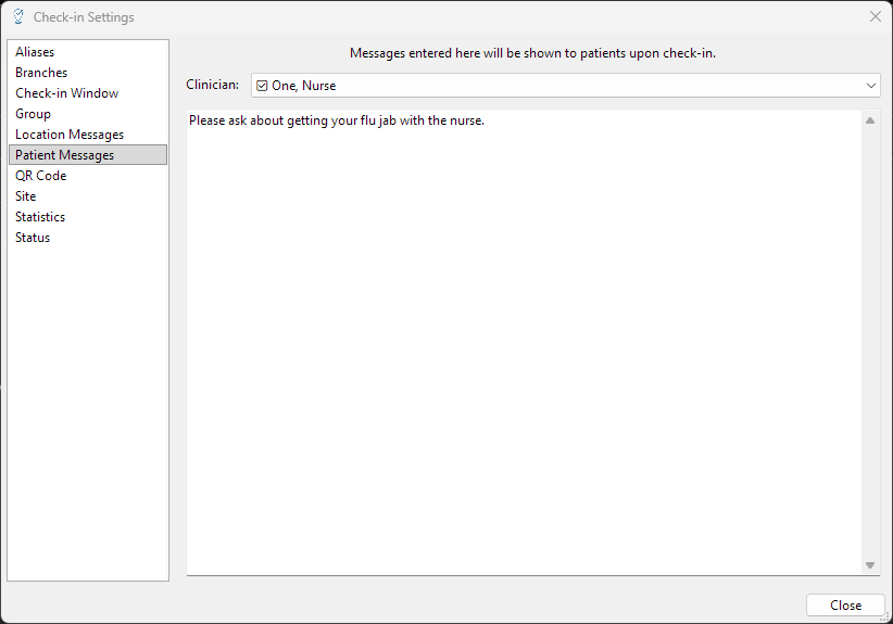 The patient messages feature allows you to give a message to the patient when they check in for the selected clinician. To use, click the Clinician drop-down menu and select the required clinician. You can enter the message you wish to display to the patients checking in for that clinician.