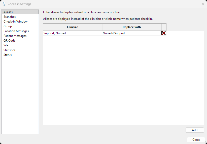 This feature allows you to change the name of a clinician or clinic from how it appears in the clinical system to something else. To use, click Add, then click in the Clinician field, and a drop-down menu will appear with the list of all clinicians and clinics. Select the clinician you wish to change the name of, then in the Replace with field, put how you would like them to appear on the Check-In screen. To remove an alias, click the X to the right of the name.