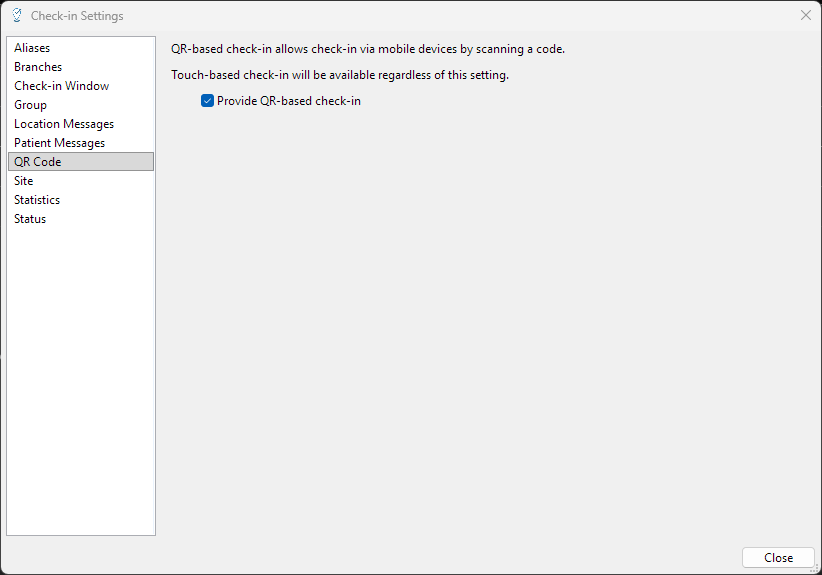 This menu allows you to turn the QR code check-in feature on or off. If you remove the tick in Provide QR-based check-in, the QR code on the check-in screen will be removed.