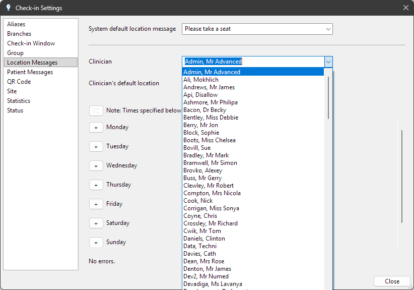 If you want to set a different location for a clinician, choose the clinician's name from the Clinician drop-down menu. If you've applied an alias within the Check-In software, it will display that name instead.