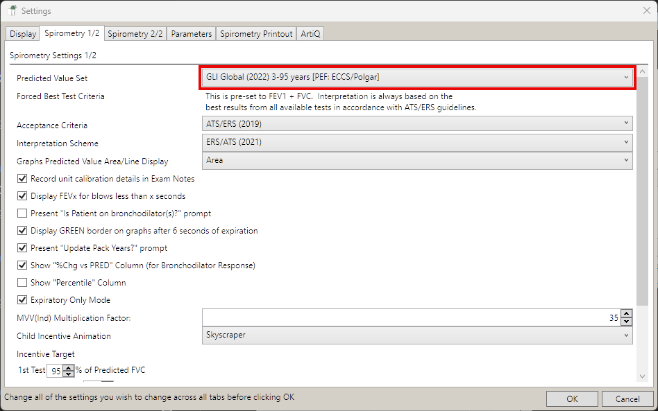 There are two different ways of working with the GLI Global values. Depending on your preferences, you can either choose to use GLI Global at the start of each spirometry examination or use GLI Global for all patients.