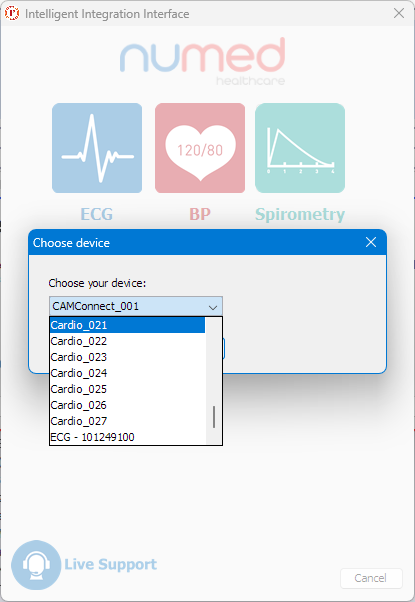 - When you run the Intelligent Integration Interface you will get the option to Choose device, if the device you are using is missing from the list please contact Numed support via the chat button on this page.