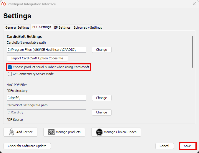 - Put a tick in Choose product serial number when using CardioSoft, and then click Save