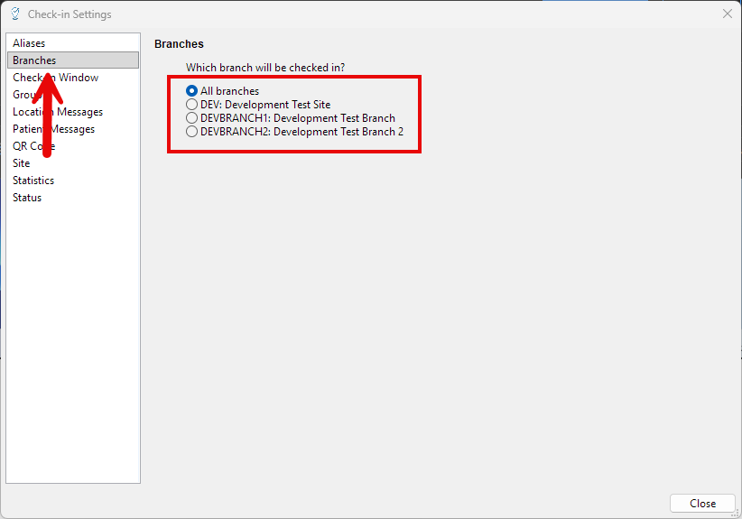 Select the Branches menu on the left-hand side, then choose the physical site where your Envisage Check-In is installed. As soon as you click close, the system will restrict the check-in to that physical site