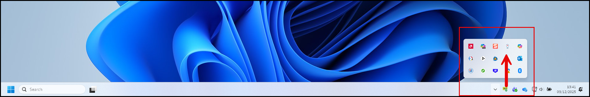 On the PC that has the software installed, ensure that the clinical system is running. Then go to the notification tray in the bottom right-hand corner of the screen. You may need to click the ^ to access it. You need to look for the Check-In icon .