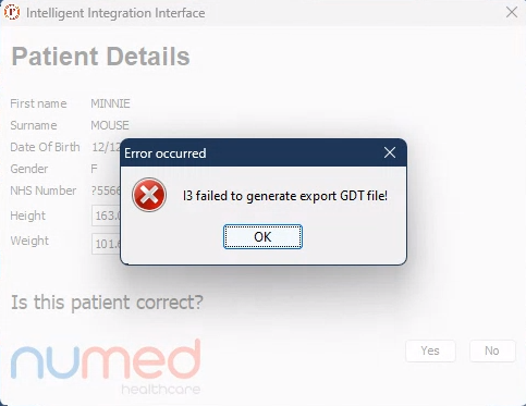 This issue commonly occurs in Vision clinical systems and is caused by the patient ID (NHS or CHI number) containing non-numeric characters. In the example image, the NHS number begins with a question mark (?).