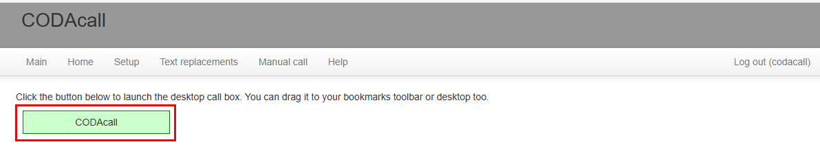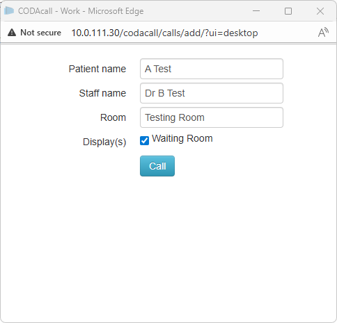 The URL of the box can be added for easy access as a bookmark or favourite to the browser or as a shortcut on the desktop. The URL format will always be http://<Local IP>/codacall/calls/add/?ui=desktop