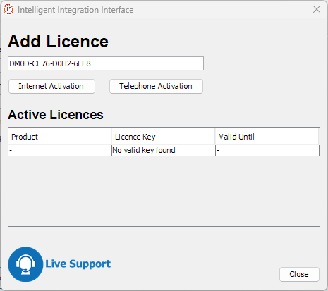 Enter the supplied license key and click Internet Activation, click Close once the license is activated - the license key in the image below is a dummy and will not activate.