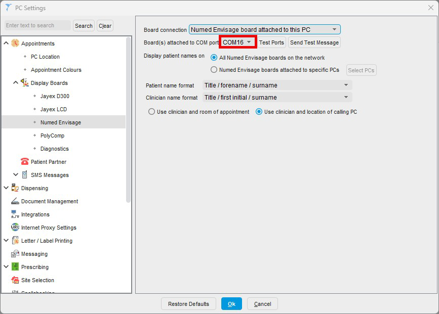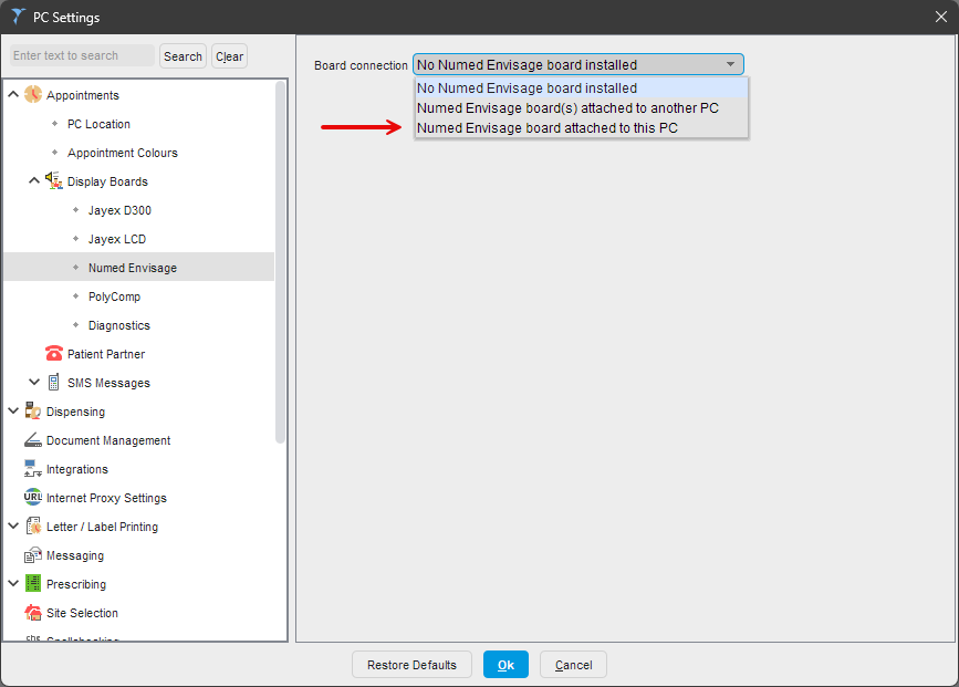- Click the Board connection drop-down menu and select the Numed Envisage board attached to this PC.