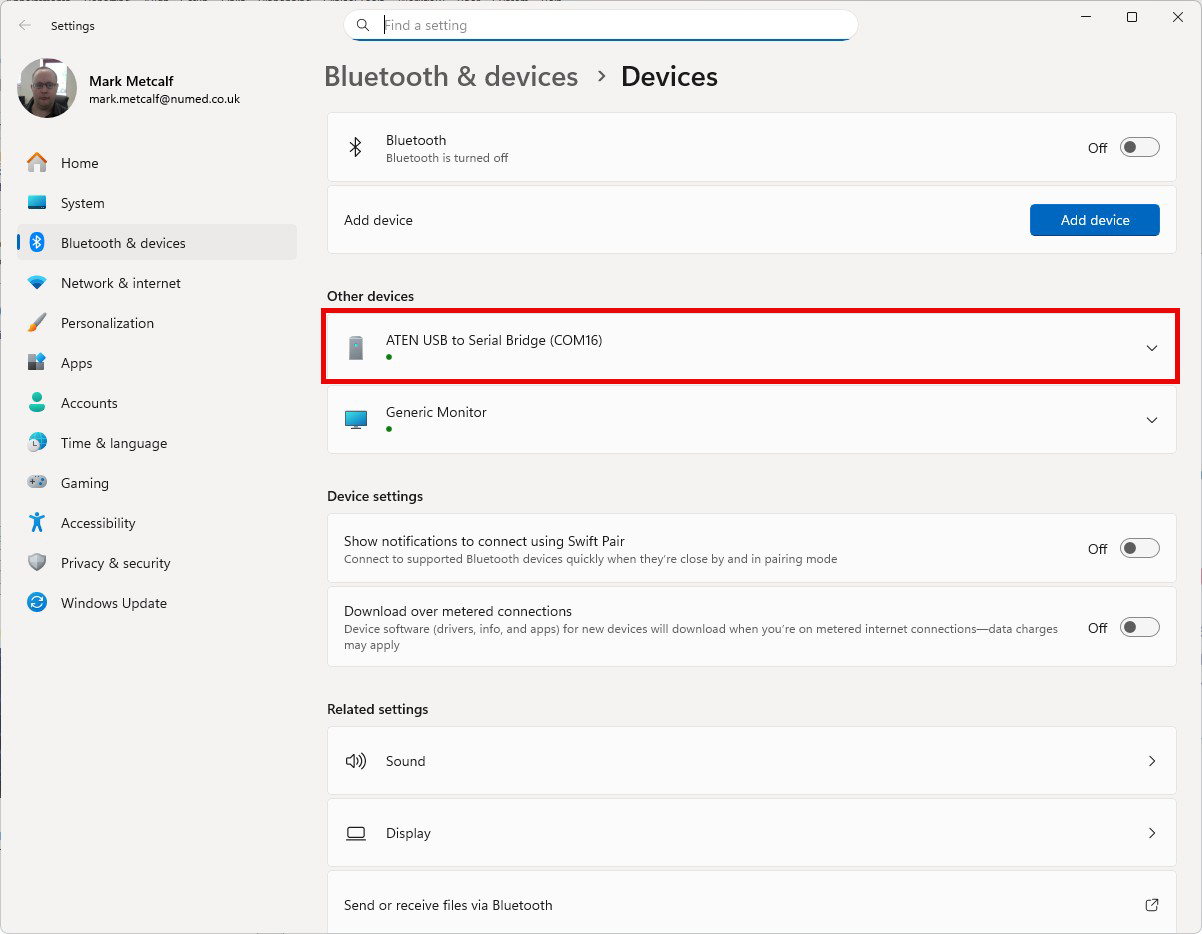 - Under Other devices, locate the ATEN USB to Serial Bridge and make a note of the COM number. If the ATEN USB to Serial Bridge is missing, please see How to install the PC cable for Patient Call