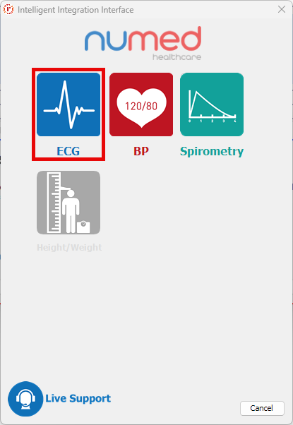 - Select ECG from the product selection screen - if you have more than one ECG system, you may need to select Schiller CS-104.