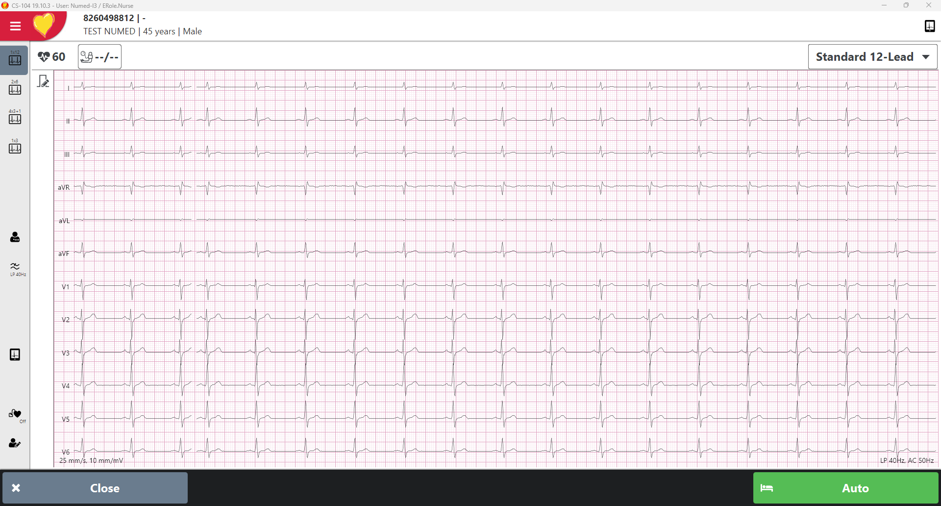 - Once you are happy with the ECG trace, click the Auto button or the Start button on the machine to capture the most recent 10 seconds of ECG.